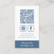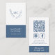Dusty Blue Monogram Wreath with Slogan Vertical Business Card... The front of our unique dusty blue business card features an elegant botanical wreath bordering your two monogram initials in blue ink on a white background. Your name and title (or company name) appear in white ink on a dusty blue rectangle bordering the bottom of the business card, giving an authoritative structure to balance the delicate leafy wreath. On back of the card are your phone number, social media contact info, website address and QR code linking to additional information. The dusty blue section on bottom contains your business motto or tagline. Example text currently shows "Always take the high road" in white script typography. All text and the QR code can be easily revised on the personalisation template.