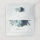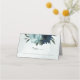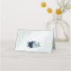 Unique wedding place card featuring romantic dusty blue and navy flowers and green leaves