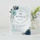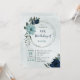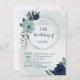 Unique birthday party invitation featuring romantic dusty blue and navy flowers and green leaves botanical geometric frame.