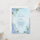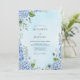 This design features a dreamy, artistic rendering of blue hydrangeas and delicate foliage. A soft watercolor wash in subtle blues creates an ethereal and romantic atmosphere, perfect for a refined celebration.