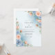 Soft watercolor washes in misty blue create an ethereal atmosphere for this romantic design. Delicate clusters of peach roses and sky blue blossoms are thoughtfully arranged with sage green foliage. The painterly style evokes a serene feeling, perfect for an elegant spring or summer wedding.