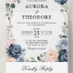 Dusty blue floral geometric all in one wedding Invitation featuring elegant bouquets of navy / Dusty blue, white , blush , peach rose and sage green eucalyptus leaves and elegant glitter geometric neutral frame. Please contact me for any help in customisation or if you need any other product with this design.