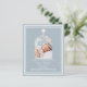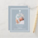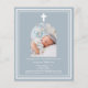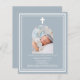 Dusty blue background, decorated with a white frame, and a white cross Personalise and add a photo name and details. White text. Arch shaped photo frame.