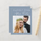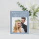 Budget-friendly dusty blue private wedding or elopement announcement and reception or celebration party invitation. The front features your photo and "Happily Ever After Party" in a mix of simple white typography and a chic modern white script. Underneath your photo, add your names and wedding date. On the back, personalise your message and reception details, input your wedding website address to create a QR code for your guests to scan for more information and to RSVP online, and add your names in a signature-like white script.