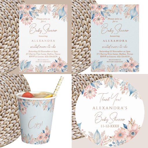 Celebrate in style with these Personalised Boho Floral Baby Shower paper napkins, perfect for an excited mum-to-be! These elegant napkins feature a stunning design of dusty pink, beige, and blue flowers and leaves against a soothing dusty blue background. The feminine and rustic charm of these napkins will add a touch of bohemian elegance to your boho chic baby shower party, lunch or picnic. Enhance your celebration with these beautifully designed paper napkins that embody the essence of a boho floral baby shower.