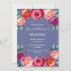 An elegant invitation card for a 50th (or any age) birthday party. With blush pink, purple and rose gold coloured watercolored flowers, florals as decoration. A trendy blue background. The name is written with a hand lettered style script.