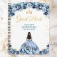 This elegant and glamourous Quinceañera guest book features a beautiful princess with dark hair in a dusty blue ball gown. The text combines handwritten script and modern sans serif fonts for a classy and sophisticated look. The floral arrangements and gold confetti create the perfect blend of rustic and chic.