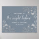 Set the tone for your pre-wedding celebration with this elegant dusty blue rehearsal dinner welcome sign. Featuring delicate vintage-inspired white floral accents and classic serif-meets-script typography, this timeless design beautifully welcomes guests to “the night before.” Personalise with your names and date for a sophisticated and romantic touch to your evening event. A perfect match for blue, grey, or floral-themed wedding decor.