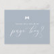 Ask family and friends to be part of your wedding with this personalised "Will you be my page boy" card. It features a cute bow, a whimsical script and a dusty blue background. Personalise by adding a name and message