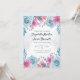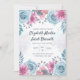 Invitation design features dusty blue roses and pink flowers.