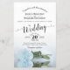 This beautiful wedding invitation features a romantic design with a single long stemmed pale dusty blue rose laying on its side and reflecting in a pool of water. The typography features lacy script calligraphy and a sophisticated layout. The back is a marbled light purple colour. Wonderful way to invite your friends and family to share in your joy on your special day.