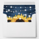 Custom rustic dusty blue and sunflower wedding envelopes with a return address. Our dusty blue rustic wedding envelopes feature sunflower flowers, barn wood and string lights. Matching items available.