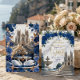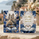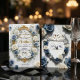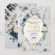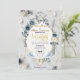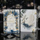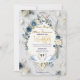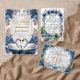 This design features a graceful illustration of a swan couple with detailed feathered wings, resting beneath an arch of dusty blue roses, navy florals , and sage green eucalyptus foliage. The artwork is set against a soft ivory and cream background with subtle gray marbling. A geometric frame surrounds the text, rendered in a muted faux gold tone to simulate a metallic shine. The typography combines an elegant handwritten calligraphy script for names with a traditional serif font for details.This is a flat printed image with a faux gold foil and marble effect, not actual raised metal or stone material.