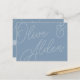Designed to match our Script Watermark wedding invitations, this elegant typography based RSVP postcard is perfect for traditional mail-in RSVPs. Design features oversized script lettering at the top, in tone on tone shades for a watermark effect. Personalise with your desired RSVP date and custom accept and decline wording in classic serif lettering. Our Dusty Blue colorway is an elegant mix of ethereal blues, with white and blue-grey lettering on a dusty medium blue background.