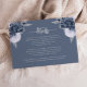 This elegant modern wedding details enclosure card features dusty blue and silver floral bouquets in two corners on a dusty blue background. The title appears in silver grey handwriting script, with customisable text below in copperplate font. The reverse side features a matching dusty blue and silver floral design.