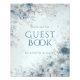 Dusty Blue Silver Rose winter floral wedding guest book sign featuring elegant calligraphy script modern watercolor flowers white roses snowflake and botanical boho design