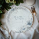 Dusty Blue Silver Rose winter floral wedding paper plate featuring elegant calligraphy script modern watercolor flowers white roses snowflake and botanical boho design