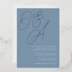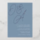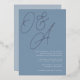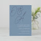 A beautiful typography based monogram wedding invitation featuring your initials in oversized silver foil script lettering at the top, in tone on tone shades for a watermark effect. Personalize with your wedding details in classic serif lettering aligned at the lower right. Our Dusty Blue colorway is an elegant mix of ethereal blues, with white and blue-gray lettering on a dusty medium blue background.