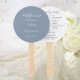 Wedding day program printed on a round style hand fan that features a trendy, dusty blue colour background on the front side with the bride and groom names in white, stylised script. Back side of program lists the wedding party participants and ceremony rites on a white background with dark grey lettering. Edit hand fan and replace wedding program info with your own. Perfect for an indoor or outdoor wedding ceremony! Select number of hand fan programs desired.