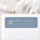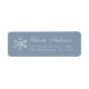An elegant dusty blue and silver return address label, recommended for the winter holidays greeting card. It has a faux silver foil snowflake on the left and light gray text on the right. The name is written in an elegant calligraphy, the address in smaller caps. It can be used for a Christmas or a New Year greeting card. The background is dusty blue.
