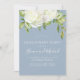 An elegant, floral engagement party invitation with a beautiful arrangement of watercolor white peony flowers and greenery. Shown with a dusty blue background colour which can be customised to match your wedding theme. Just select the 'customise it' button to see additional design options.