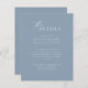 This dusty blue wedding details card offers a beautifully minimalist and elegant way to share important information with your guests. The clean layout, modern typography, and soft script accents create a refined, stylish look that complements any contemporary wedding suite. Perfect for reception directions, accommodations, and extra notes, it adds a polished finishing touch to your celebration stationery.