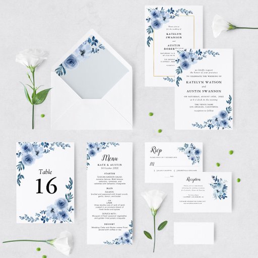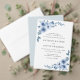 A floral garland with elegant blue flowers. You can personalise the text and colour features of this card.