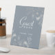 Guide your guests with this elegant dusty blue wedding guest book sign, featuring delicate white floral illustrations and refined script. A stylish and practical touch for your welcome table, this pedestal sign encourages friends and family to share their well-wishes and memories in your guest book with grace and simplicity.