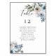 Elegant dusty blue floral wedding table number and seating chart with guest list