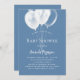 Dusty blue background, decorated with white balloons. Personalise and add a name and party details.