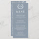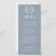 Enhance the charm of your wedding reception with these sophisticated and stylish dusty blue wedding menu cards. Decorated with delicate white flower blossoms and showcasing a timeless floral wreath embellished with the bride and groom's monogram, these cards exude an air of elegance and refinement. Discover the ideal menu cards to complement your unforgettable celebration.