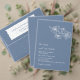 White line art cherry blossoms on a dusty blue background. Elegant wedding RSVP card. Botanical hand drawn design.