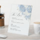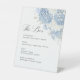 An elegant Dusty Blue & White floral wedding bar menu pedestal sign, featuring a soft watercolor hydrangea bouquet and refined modern classic typography.
