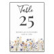 This Dusty Blue Watercolor Wildflowers Elegant Script Wedding Table Number showcases delicate watercolor wildflowers in dusty blue, purple, and yellow on a white background, complemented by contemporary typography and script calligraphy in grey. The formal design and wording will add a touch of elegance to your wedding celebration.