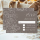 This elegant wedding rsvp features a delicate floral ornamental design with flowers, birds and leaves on a dusty brown grey background. The text combines handwritten script and serif fonts for a stylish and modern look. Perfect for a winter or autumn fall wedding.