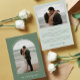 Beautiful and elegant photo thank you card to send to your wedding guests in green. Double sided wedding thank you card with two photos, one in an arch shaped frame with LOVE & THANKS written in a curve. Green wedding thank you card with your names in a modern pale green brush script. Grey and white photo thank you cards for the newly weds. Add your own personal thank you message to the back of the double-side photo thank you card.