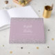 This elegant wedding guest book features top and bottom borders of faux silver glitter on a dusty lilac background. Easily customise the white text with the names of the bride and groom in whimsical handwriting calligraphy over a large, pale lilac ampersand. Add additional text of your choice to the front and spine.