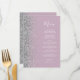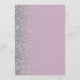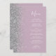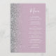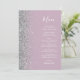 The left-hand edge of this elegant modern wedding menu features a faux silver glitter border. The customisable text combines white whimsical handwriting script and copperplate fonts on a dusty lilac background. The reverse side features a matching lilac and silver glitter design.