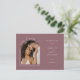 This save the date engagement announcement invitation postcard features an elegant calligraphy and simple typography font with an arch shape heading and photo on a dusty purple background and QR Code. The simplicity of this design adds a touch of elegance to your wedding save the date invitation cards. It works well with many wedding themes and definitely a great addition to your wedding. Just customise the names and wording in a few easy steps and personalise the invitation postcard with your photo of the happy couple and replace the QR Code with yours on the back to give your postcard a nice personal touch.