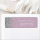 The left-hand edge of this elegant modern wedding return address label features a silver faux glitter design. The customisable text combines white handwriting and copperplate fonts on a dusty lavender purple background.