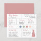 A dusty rose (pink) bridesmaid information card, including information about the wedding date and location, the wedding colours, the bridal party, the bridesmaid dress and a bridesmaid proposal message. In the upper left corner, the name of the bridesmaid is written in a dusty rose handwriting script. In the lower right corner, there is a dusty rose dress. In the centre, there are the wedding colours in circles. The default colours are dusty blue, sage green, dusty rose, blush pink and white. The colours, including the colour of the wedding dress, can be changed.