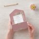 All-in-one wedding invitation featuring elegant botanical watercolor greenery leaves on a dusty rose pink background and a chic gold frame border. The invitation includes a perforated RSVP card featuring a QR code. Designed by Thisisnotme©