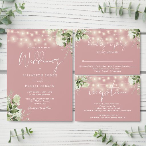 Dusty Rose Greenery Floral String Lights Wedding RSVP Card