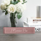 Elegant desk nameplate features your name, title, or choice of personalisation in white hand lettered cursive lettering on a dusty rose mauve pink background.