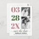 Dusty rose and moss green two photo Save the Date postcard. It showcases the date in dusty rose pink and moss green typography in a column and two photos of the couple. The phrase "Save the Date" is in script style typography.
