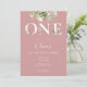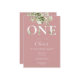 A cute first 1st birthday invitation featuring watercolor floral greenery on a dusty rose pink background. Designed by Thisisnotme©
