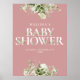 An elegant baby shower sign featuring modern typography and pretty botanical greenery foliage on a dusty rose pink background. Designed by Thisisnotme©