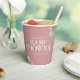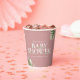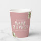 An elegant girl baby shower paper cup featuring chic typography and pretty botanical greenery foliage on a dusty rose pink background. Designed by Thisisnotme©