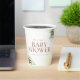 An elegant baby shower paper cup featuring chic dusty rose pink typography and pretty botanical greenery foliage. Designed by Thisisnotme©