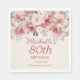Elegant dusty rose/red and cream-coloured watercolor floral 80th birthday party paper napkins personalised with the name of the guest of honour, her party date and age, and a "Thank you" message. Contact me for assistance with your customisations or to request additional matching or coordinating Zazzle products for your party.